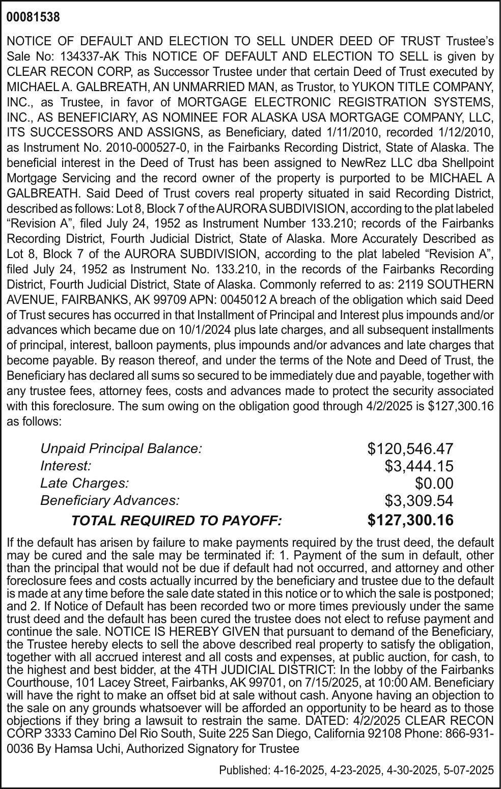 00081538 NOTICE OF DEFAULT AND ELECTION TO SELL UNDER DEED OF TRUST Trustee’s Sale No: 134337-AK This NOTICE OF DEFAULT AND ELECTION TO SELL is given by CLEAR RECON CORP, as Successor Trustee under that certain Deed of Trust executed by MICHAEL A. GALBREATH, AN UNMARRIED MAN, as Trustor, to YUKON TITLE COMPANY, INC., as Trustee, in favor of MORTGAGE ELECTRONIC REGISTRATION SYSTEMS, INC., AS BENEFICIARY, AS NOMINEE FOR ALASKA USA MORTGAGE COMPANY, LLC, ITS SUCCESSORS AND ASSIGNS, as Beneficiary, dated 1/11/2010, recorded 1/12/2010, as Instrument No. 2010-000527-0, in the Fairbanks Recording District, State of Alaska. The beneficial interest in the Deed of Trust has been assigned to NewRez LLC dba Shellpoint Mortgage Servicing and the record owner of the property is purported to be MICHAEL A GALBREATH. Said Deed of Trust covers real property situated in said Recording District, described as follows: Lot 8, Block 7 of the AURORA SUBDIVISION, according to the plat labeled “Revision A”, filed July 24, 1952 as Instrument Number 133.210; records of the Fairbanks Recording District, Fourth Judicial District, State of Alaska. More Accurately Described as Lot 8, Block 7 of the AURORA SUBDIVISION, according to the plat labeled “Revision A”, filed July 24, 1952 as Instrument No. 133.210, in the records of the Fairbanks Recording District, Fourth Judicial District, State of Alaska. Commonly referred to as: 2119 SOUTHERN AVENUE, FAIRBANKS, AK 99709 APN: 0045012 A breach of the obligation which said Deed of Trust secures has occurred in that Installment of Principal and Interest plus impounds and/or advances which became due on 10/1/2024 plus late charges, and all subsequent installments of principal, interest, balloon payments, plus impounds and/or advances and late charges that become payable. By reason thereof, and under the terms of the Note and Deed of Trust, the Beneficiary has declared all sums so secured to be immediately due and payable, together with any trustee fees, attorney fees, costs and advances made to protect the security associated with this foreclosure. The sum owing on the obligation good through 4/2/2025 is $127,300.16 as follows: Unpaid Principal Balance: Interest: Late Charges: Beneficiary Advances: TOTAL REQUIRED TO PAYOFF: $120,546.47 $3,444.15 $0.00 $3,309.54 $127,300.16 If the default has arisen by failure to make payments required by the trust deed, the default may be cured and the sale may be terminated if: 1. Payment of the sum in default, other than the principal that would not be due if default had not occurred, and attorney and other foreclosure fees and costs actually incurred by the beneficiary and trustee due to the default is made at any time before the sale date stated in this notice or to which the sale is postponed; and 2. If Notice of Default has been recorded two or more times previously under the same trust deed and the default has been cured the trustee does not elect to refuse payment and continue the sale. NOTICE IS HEREBY GIVEN that pursuant to demand of the Beneficiary, the Trustee hereby elects to sell the above described real property to satisfy the obligation, together with all accrued interest and all costs and expenses, at public auction, for cash, to the highest and best bidder, at the 4TH JUDICIAL DISTRICT: In the lobby of the Fairbanks Courthouse, 101 Lacey Street, Fairbanks, AK 99701, on 7/15/2025, at 10:00 AM. Beneficiary will have the right to make an offset bid at sale without cash. Anyone having an objection to the sale on any grounds whatsoever will be afforded an opportunity to be heard as to those objections if they bring a lawsuit to restrain the same. DATED: 4/2/2025 CLEAR RECON CORP 3333 Camino Del Rio South, Suite 225 San Diego, California 92108 Phone: 866-9310036 By Hamsa Uchi, Authorized Signatory for Trustee Published: 4-16-2025, 4-23-2025, 4-30-2025, 5-07-2025